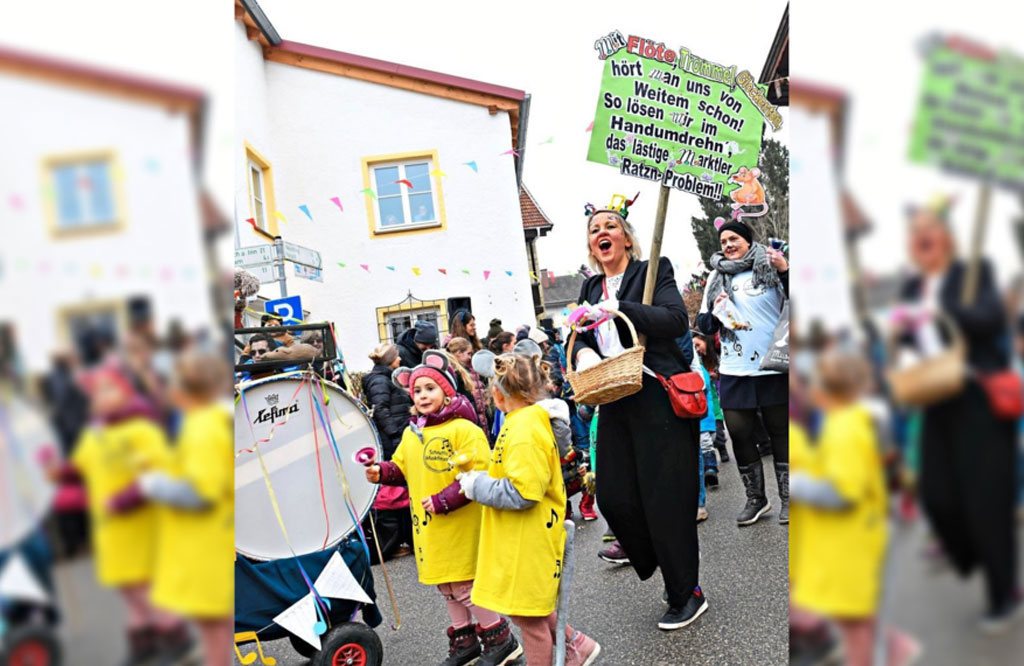 In großer Zahl erschienen die Mitglieder von „Schnuffis Musikfreunde“, Gruppen der musikalischen Früherziehung des Musikvereins Marktl-Haiming Stammham, und setzten den „Rattenfänger von Marktl“ in Szene.
